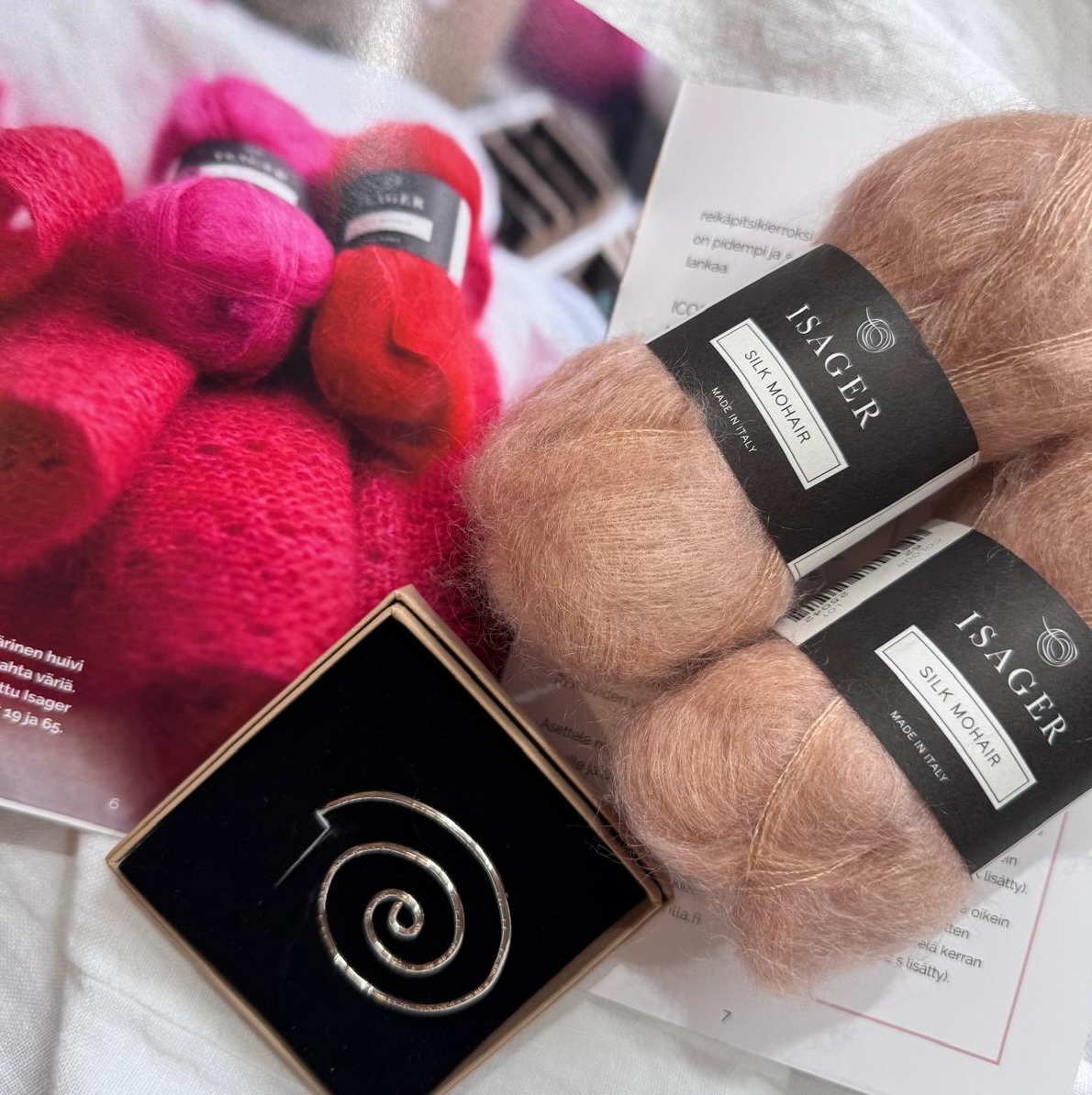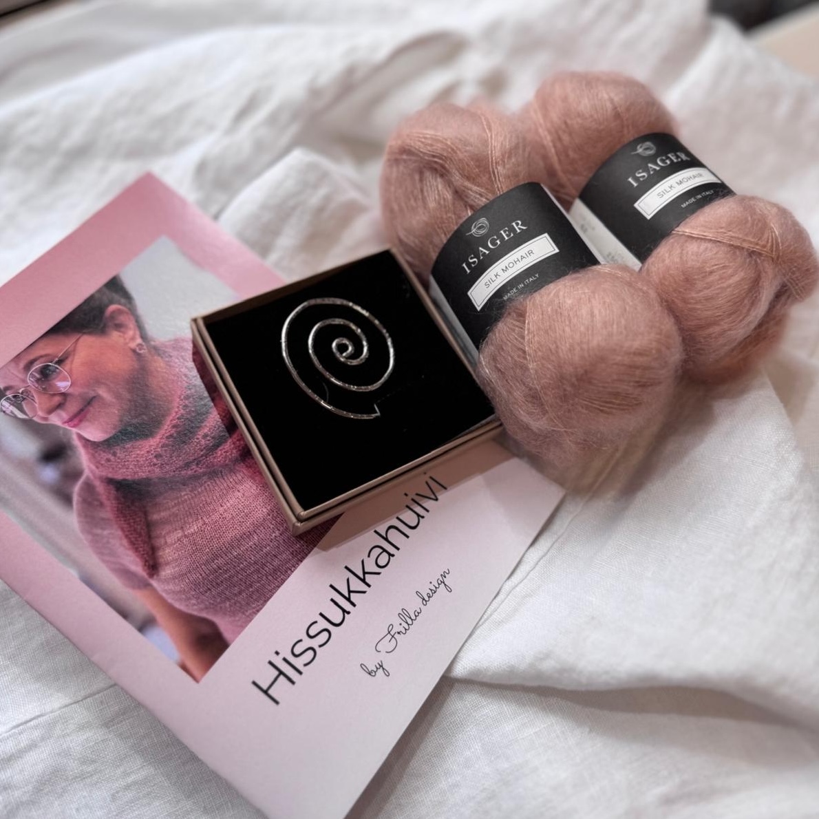 Tämä tekee kokonaisuudesta harkitun ja valmiin lahjan. Paperiohje tuo neulomiseen selkeyttä ja rauhaa, laadukas silkkimohairlanka tekee lopputuloksesta ylellisen kevyen ja pehmeän, ja hopeinen huivinpidike viimeistelee valmiin huivin kauniisti ja käytännöllisesti.