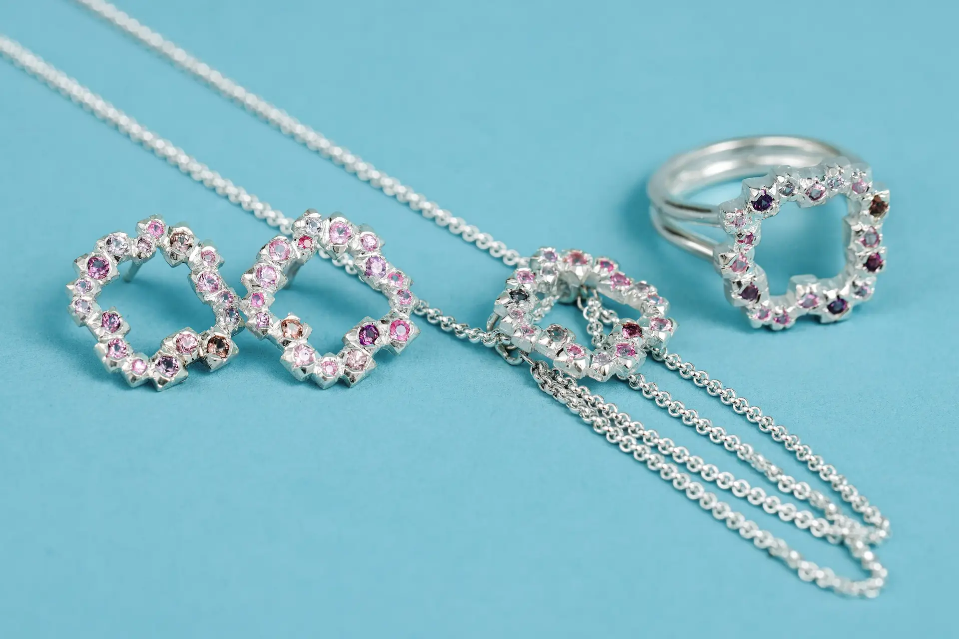 Korujen päämateriaalina toimii hopea, joka luo kauniin taustan safiirien moniväriselle loistolle.
