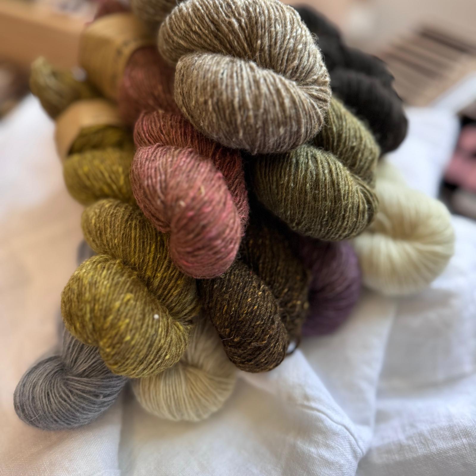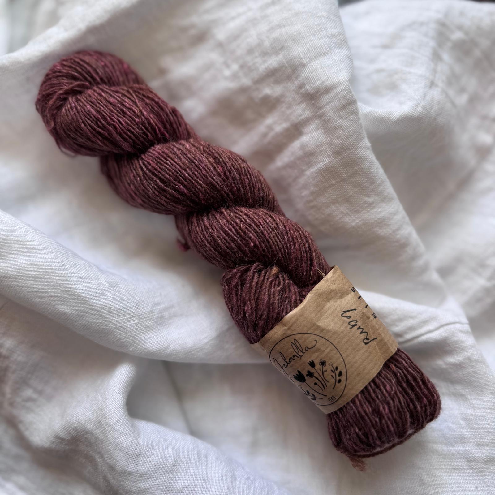 Yksisäikeinen rakenne tuo neulepintaan pehmeyttä ja elävyyttä. Käsinvärjätty pinta tekee jokaisesta vyyhdistä uniikin, ja valmiissa neuleessa sävyt muodostavat hienovaraisen, hieman tweedmäisen elävän pinnan.
