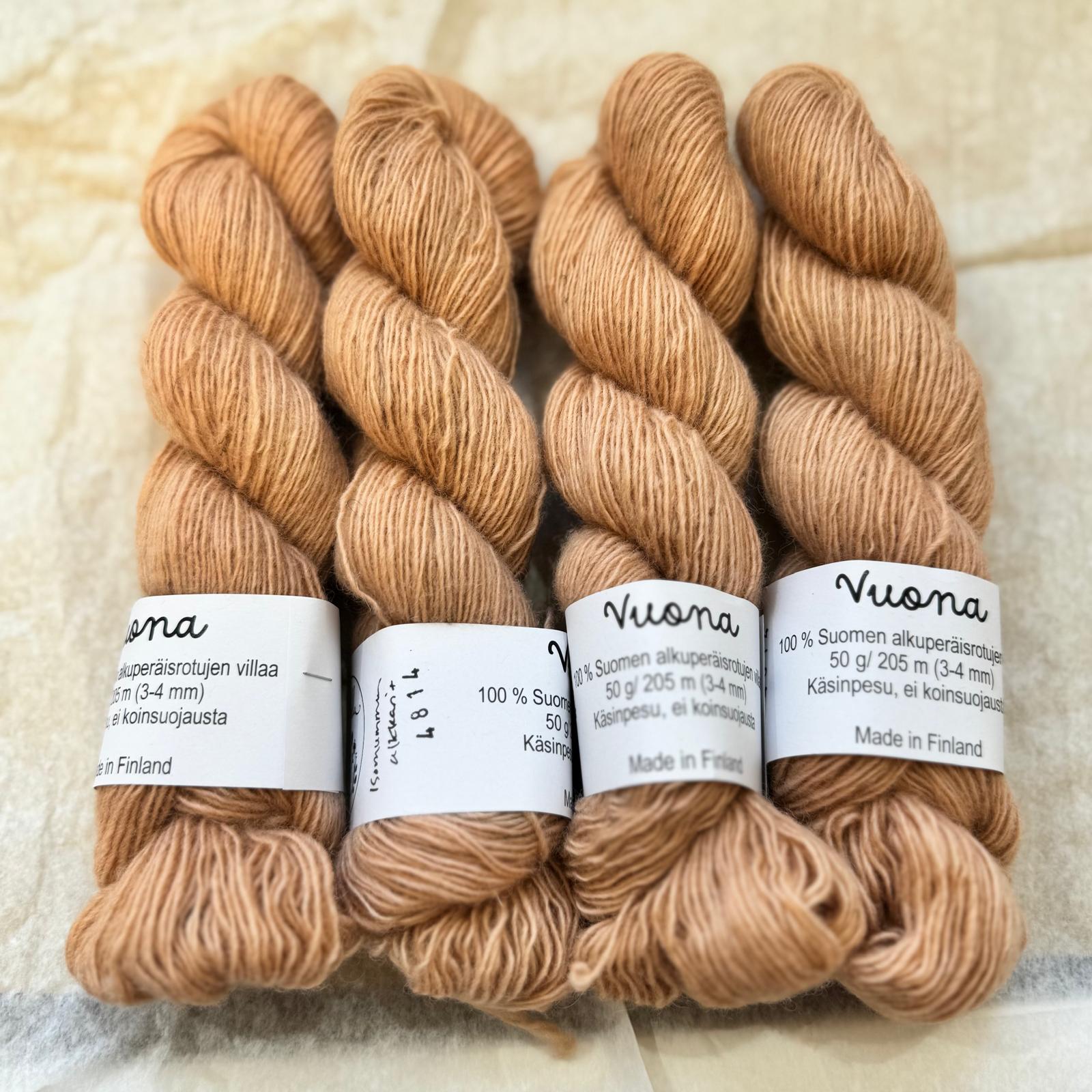 Kun neulot kotimaisesta villasta, saat vaatteita ja asusteita, jotka kestävät sekä aikaa että käyttöä. Vuona-lanka on yksisäikeinen ja kehrätty niin, että sen pehmeä, hieman pörröinen pinta tekee neuleesta kauniin elävän. Villatakit, puserot ja huivit saavat tästä langasta yksilöllisen ilmeen ja miellyttävän tunnun ihoa vasten.