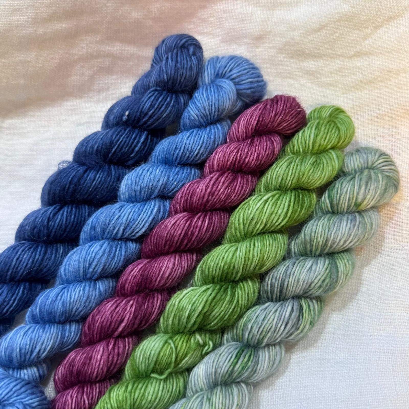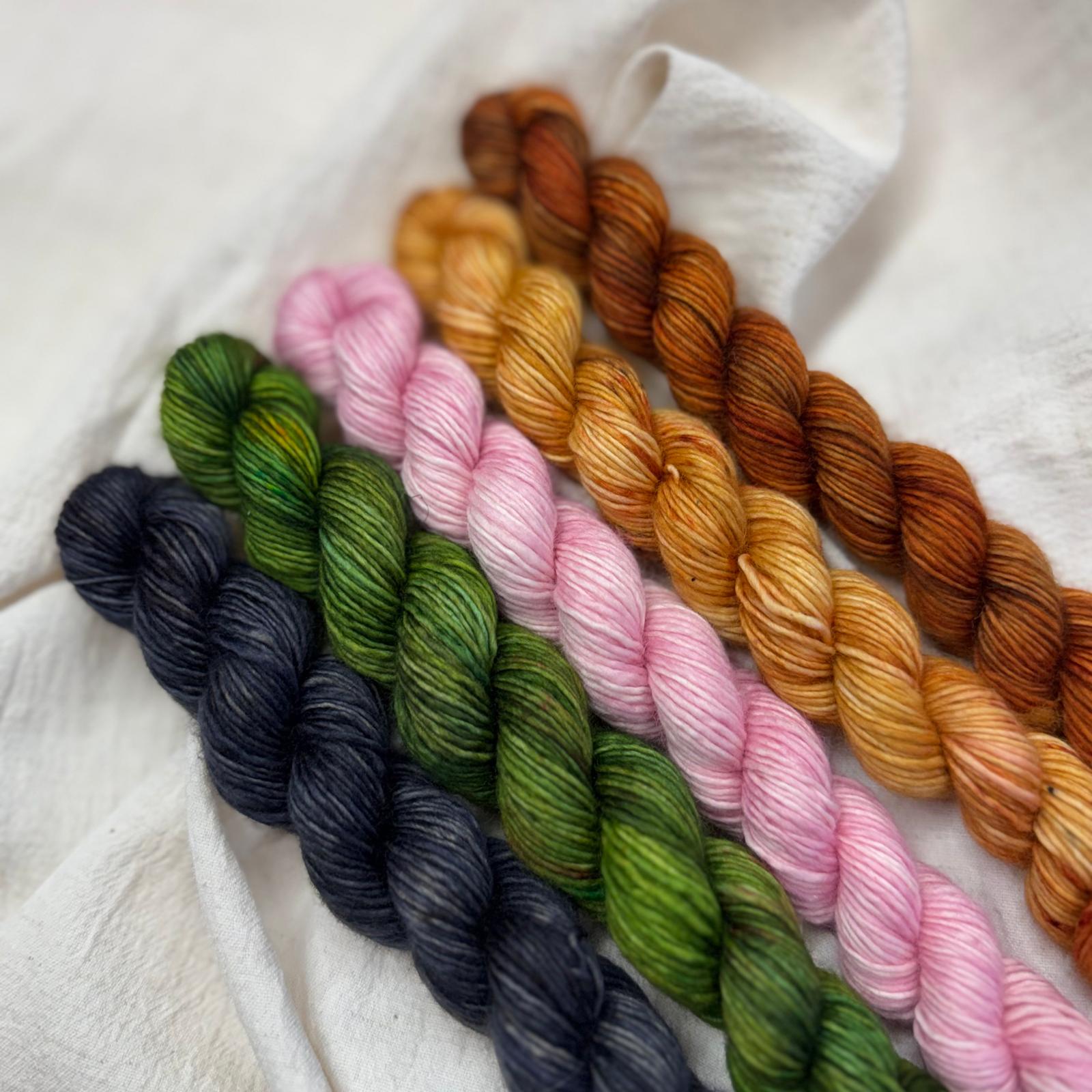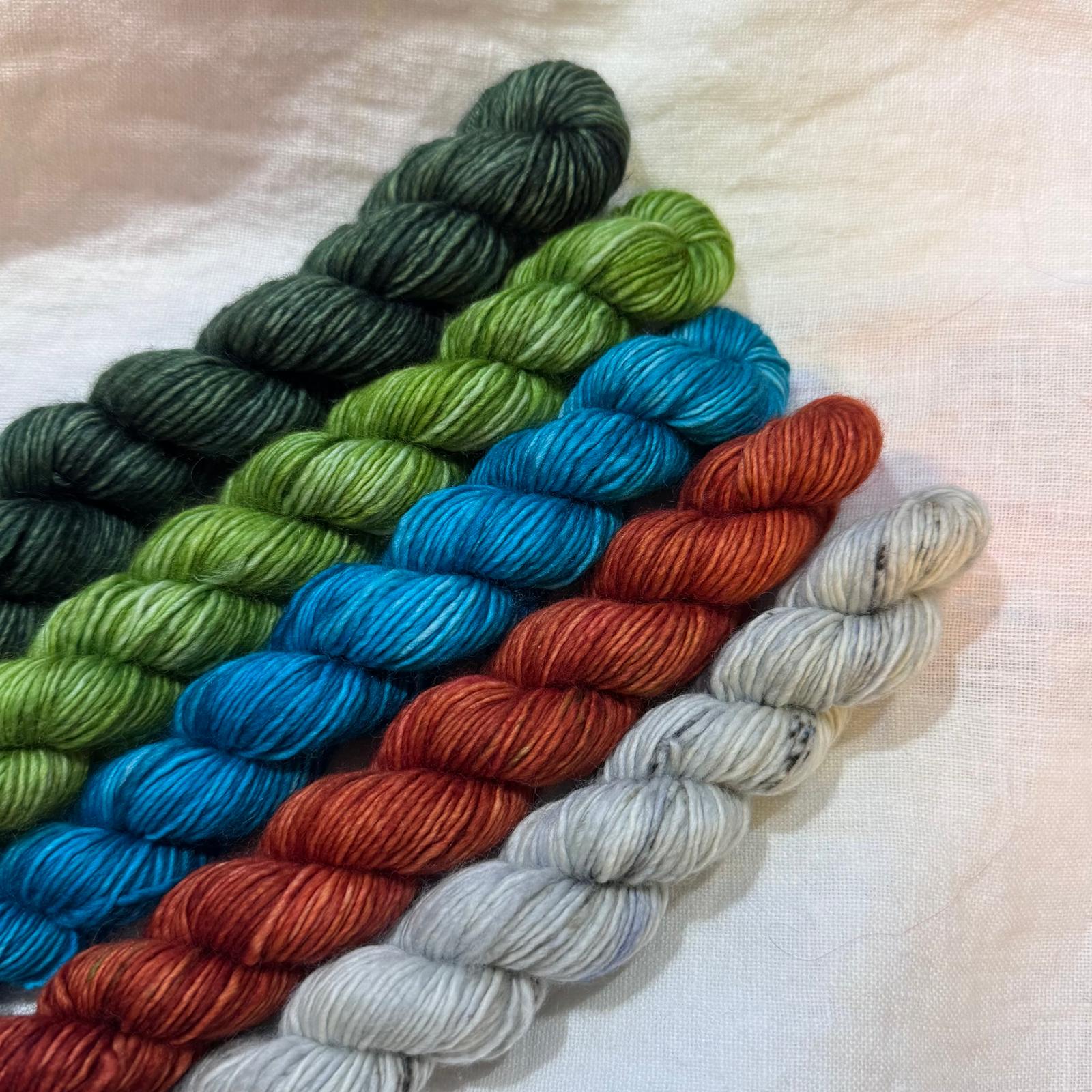 Setissä on viisi 20 gramman minivyyhtiä eli yhteensä 100 grammaa lankaa, jonka juoksevuus on noin 400 m / 100 g. Lanka on fingering-vahvuista, yksisäikeistä 100 % superwash-merinovillaa. Jokainen setti on käsinvärjätty pienissä erissä, joten värit ovat syviä, sävykkäitä ja yksilöllisiä.
