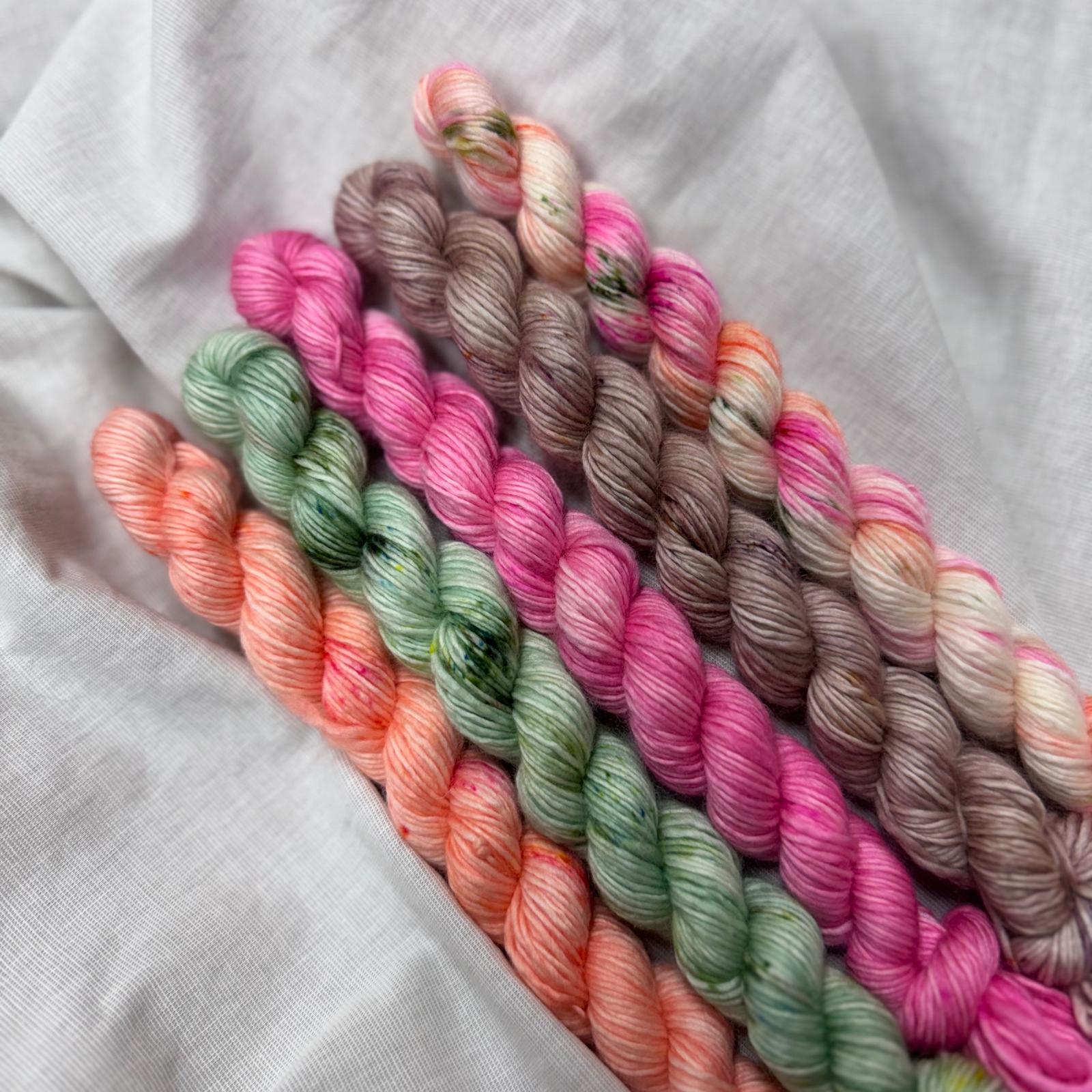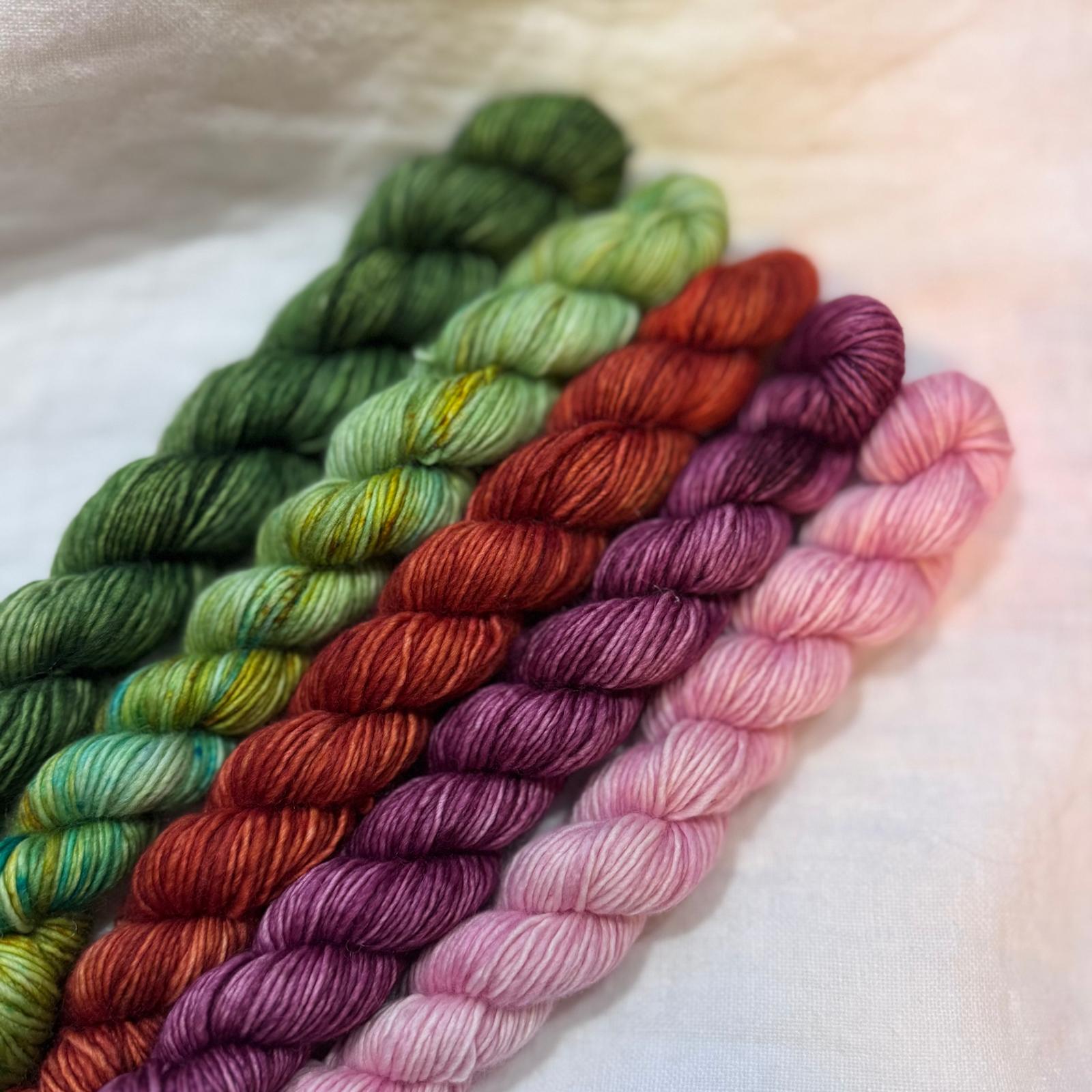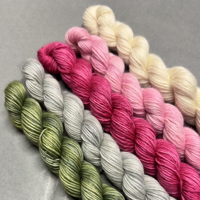 Setissä on viisi 20 gramman minivyyhtiä eli yhteensä 100 grammaa lankaa, jonka juoksevuus on noin 400 m / 100 g. Lanka on fingering-vahvuista, yksisäikeistä 100 % superwash-merinovillaa. Jokainen setti on käsinvärjätty pienissä erissä, joten värit ovat syviä, sävykkäitä ja yksilöllisiä.