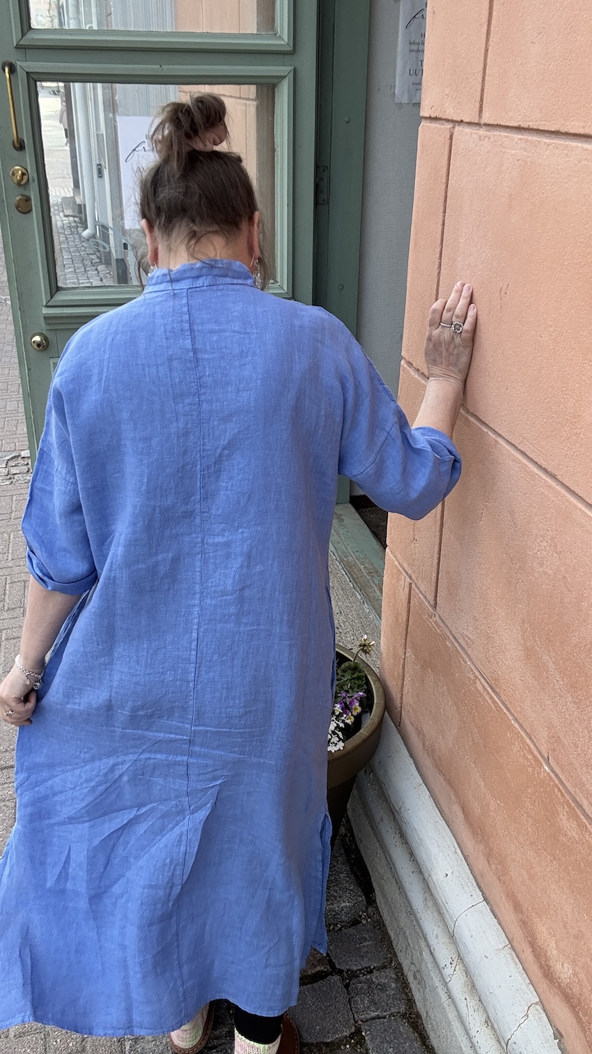 Väljä malli laskeutuu kauniisti ja antaa tilaa liikkua. Harmoniset värit ja tyylikkäät yksityiskohdat tuovat rauhallista eleganssia. Kevyt pellava hengittää helteellä ja laskeutuu rennosti. Ja mikä parasta, näyttää yhä hyvältä ryppyisenäkin.