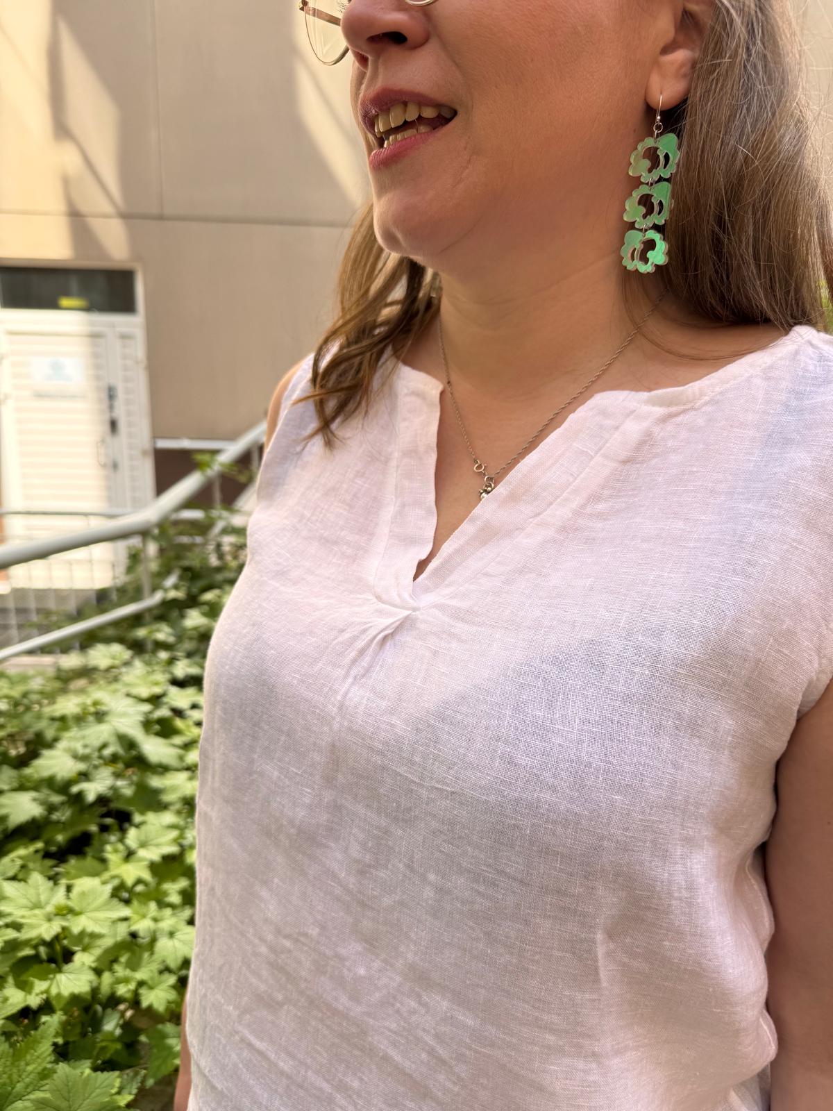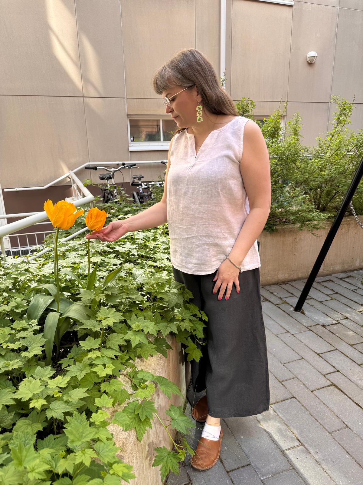 Tiina-pellavatoppi on malliltaan hieman A-linjainen: se levenee kevyesti helmaa kohti, mikä tuo liikkeeseen ilmavuutta ja antaa topille kauniin, elävän muodon. Tämä leikkaus ei ainoastaan imartele siluettia vaan tekee topista erittäin mukavan käyttää myös lämpiminä päivinä – se ei kiristä eikä takerru ihoon.
