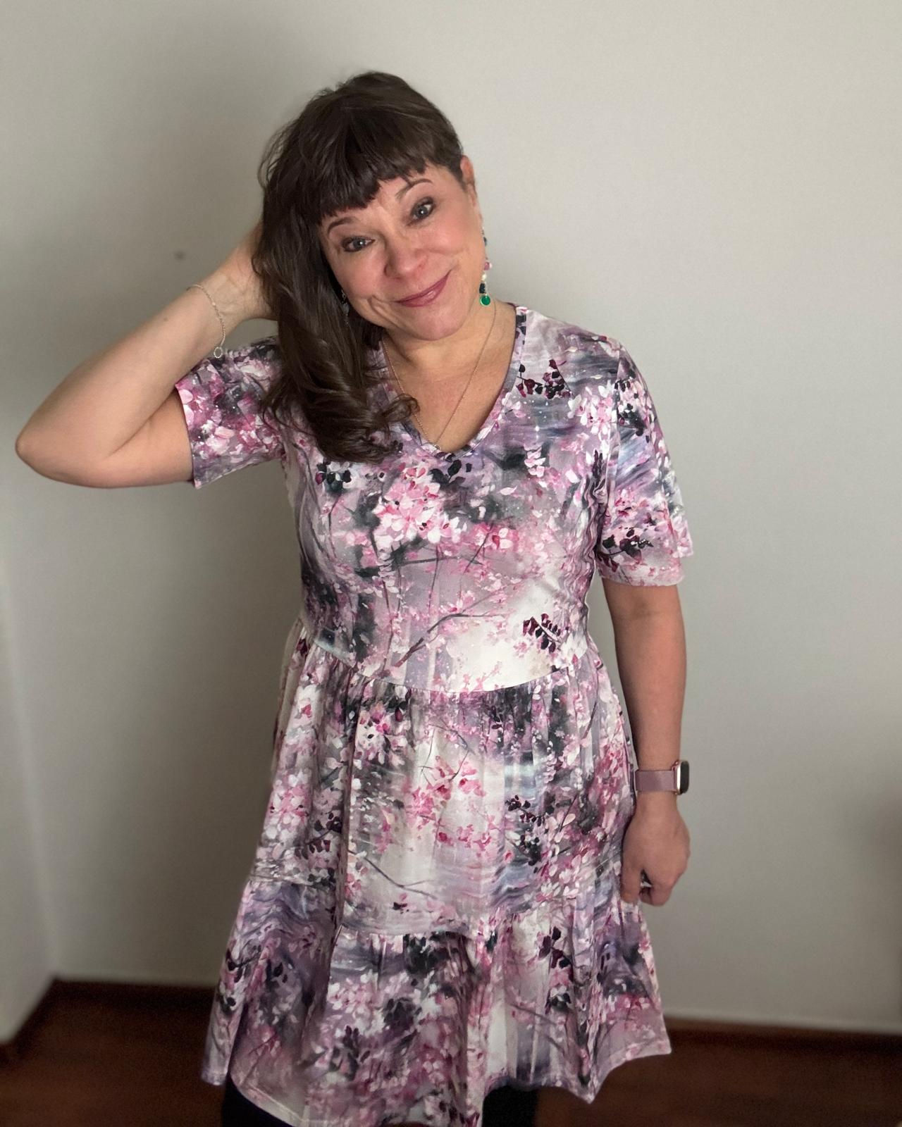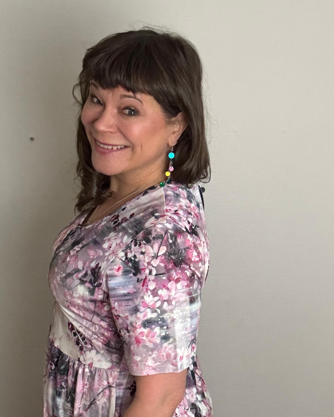 Trikoosta valmistettu SUVImekko on mukava päällä ja sopii myös kerrospukeutumiseen trikoiden, neuletakkien tai farkkutakin seuraksi. Suomalainen kuosi Kirsikkapuu vie ajatukset kesän lämpimiin päiviin.