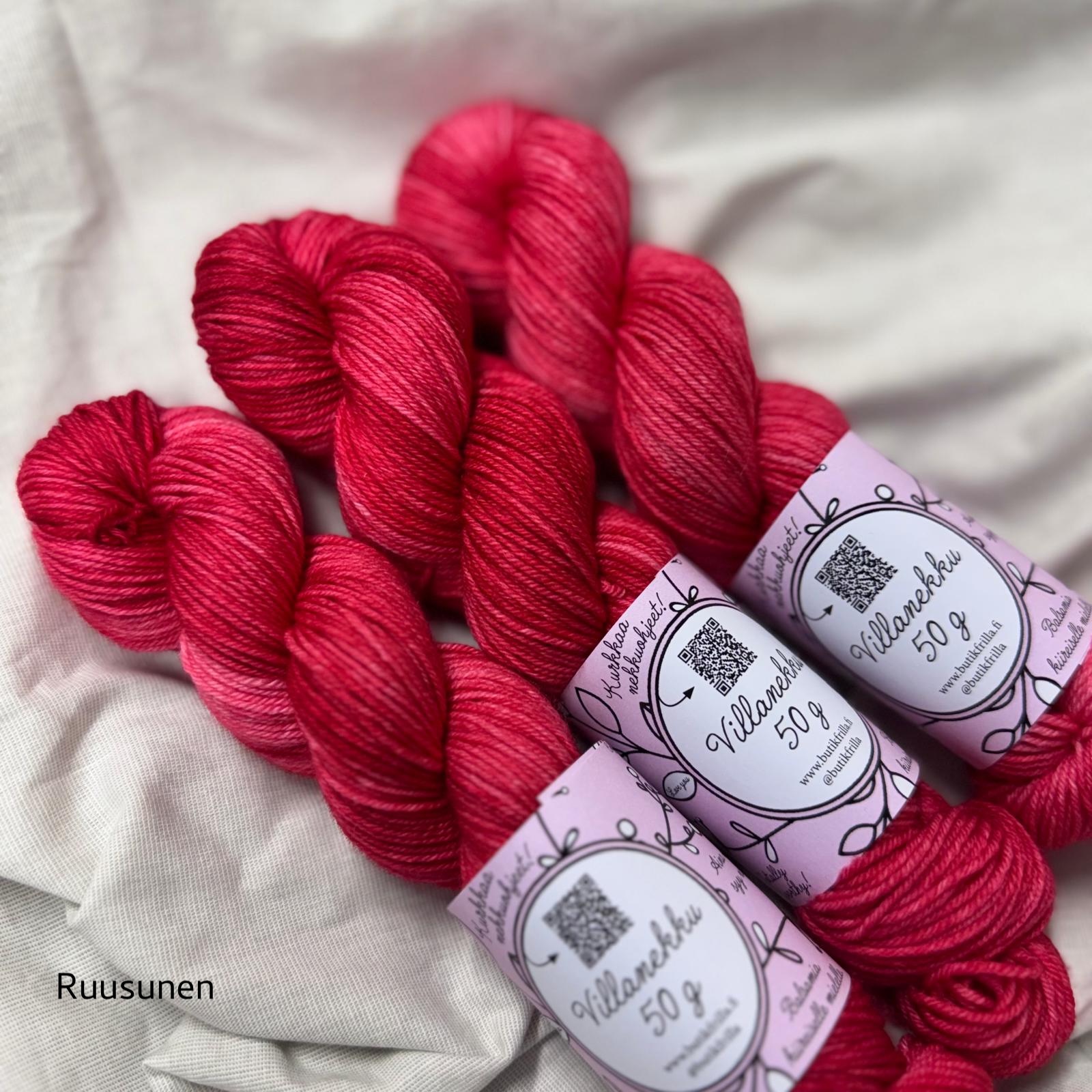 Villanekku kuuluu Sulo Woolin lankaperheeseen, ja tämä on tärkeä osa sen viehätystä. Langat värjätään Sodankylässä pienissä erissä, mikä tekee jokaisesta värjäyserästä hieman yksilöllisen. Käsinvärjäys tuo lankaan syvyyttä, elävyyttä ja sävyvaihtelua, jota teollisesti värjätyissä langoissa ei usein ole samalla tavalla.