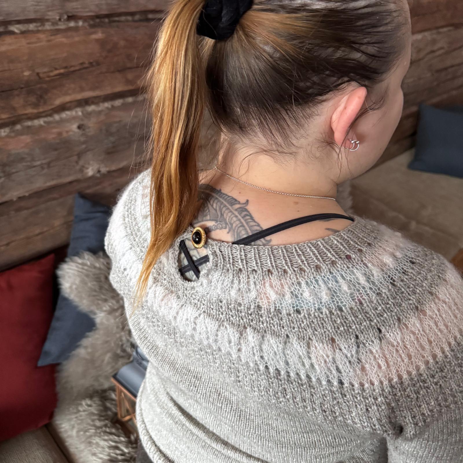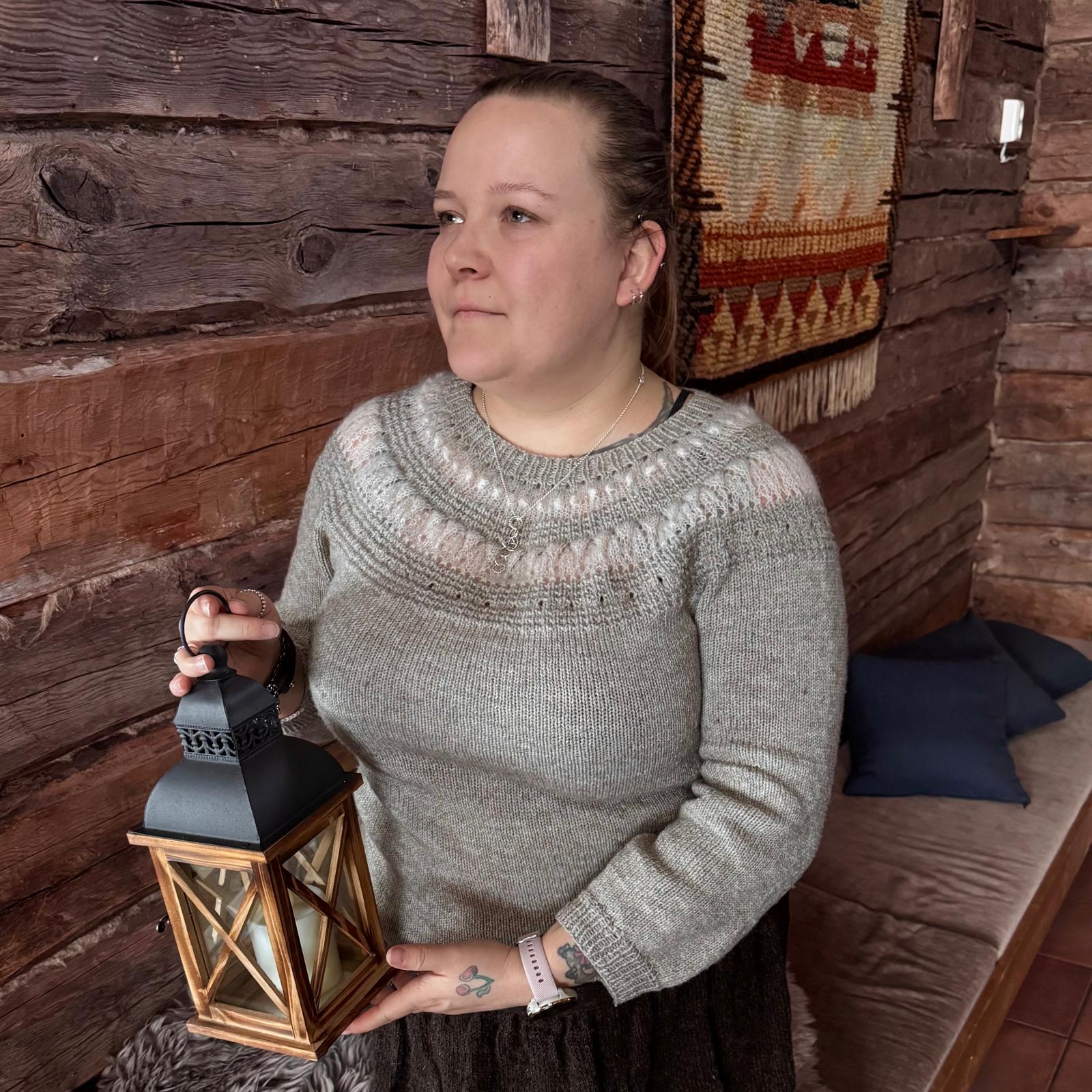 Villatar on elegantti kaarrokeneule, jossa neulepinta on rauhallinen ja selkeä, mutta kaarrokkeen pitsiraidat tuovat mukaan keveyttä ja hienostunutta ilmettä. Lopputuloksena on neulottu pitsipaita, joka toimii yhtä hyvin arkipukeutumisessa kuin huolitellummassa kokonaisuudessa.